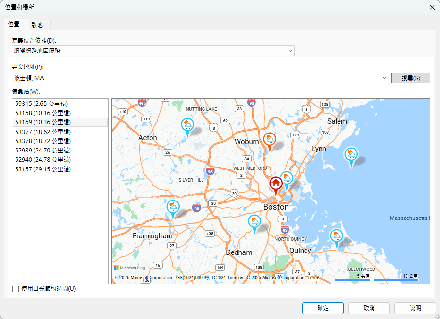 可用氣象站也會顯示在地圖中以及左側清單中。一般而言,您應選擇最接近您的位置的氣象站。但是,您可能想要選擇附近的氣象站,其高程和土地或水特徵更好地反映模型的位置。