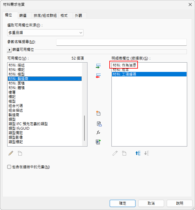 - 對於製作計量報告和製作明細表,使用油漆工具所套用的材料將可從用作主體物件元素的主體材料中區分出來。