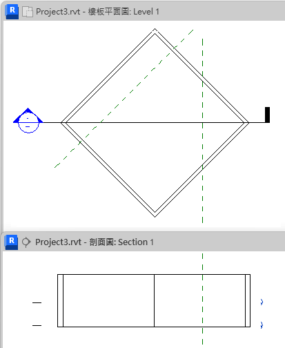 例如,下列樓板平面圖展示 2 個參考平面,以綠色虛線表示。左側的參考平面與剖面線相交成一個角度。右側的參考平面與剖面線互垂。由於斜角參考平面不與剖面線互垂,因此平面不會出現在產生的剖面視圖中。不過,互垂參考平面一定會顯示在剖面視圖中。