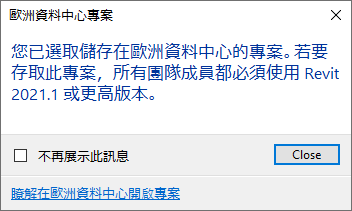 原因:2021.1 之前的 Revit 版本無法連線到歐洲資料中心位置,因此舊版 Revit 使用者必須選取美國資料中心的專案。當您在 Revit 2021.1 中選取儲存於歐洲資料中心的 Plant 3D 專案時,舊版 Revit 的使用者無法連線到 Plant 3D 專案。