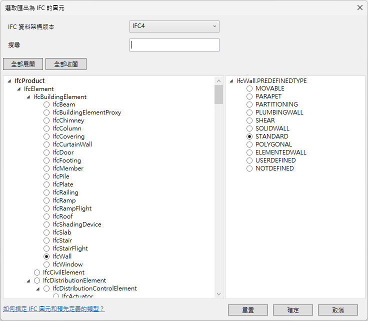 對話方塊可協助您將 IFC 圖元和預先定義的類型對映至族群實體和類型。此對話方塊可讓您選取 IFC 資料架構,然後搜尋特定 IFC 圖元。在對話方塊中選取圖元和類型,這些圖元和類型會套用至模型中元素上的參數。同樣對話方塊可用來控制 IFC 匯出中包括的圖元。 請參閱指定族群的 IFC 圖元。