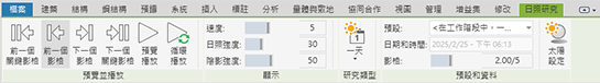(開啟太陽路徑),然後從關聯式功能表中選取「日照研究」。