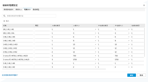 導線和電纜可加以自訂。新的「導線和電纜」設定可讓您定義導線,然後在電纜大小和電纜類型中使用這些導線定義。再將這些電纜類型指定到模型中的回路。