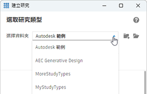 若要使用其中一個 Autodesk 範例建立研究,請在「建立研究」對話方塊中,對於「選擇資料夾」選取「Autodesk 範例」。