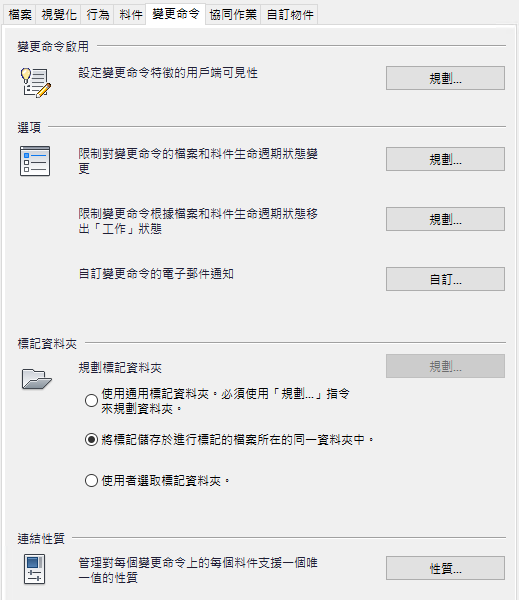 「變更命令」頁籤包含以下選項:根據生命週期或狀態將料件變更限制為變更命令、規劃標記資料夾、管理變更命令連結性質,以及定義變更命令編號規則。您也可以停用「變更命令」功能。