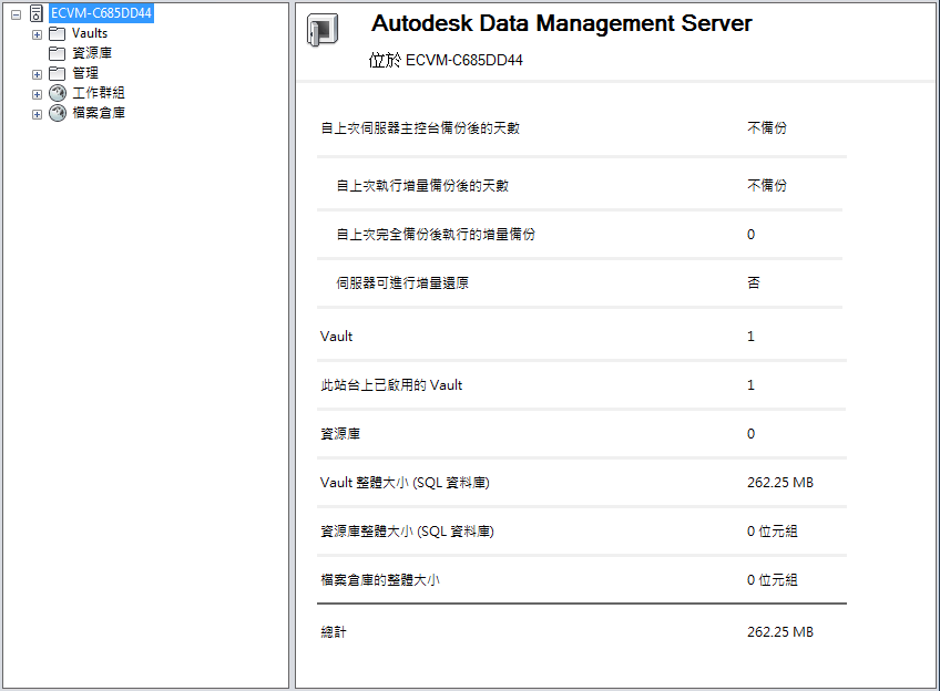 檢視所選 Vault 伺服器的詳細資料,包括自上次伺服器主控台備份之後的天數、啟用的 Vault 數量和資源庫數量。