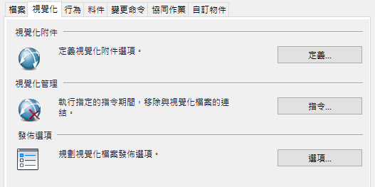 「視覺化管理」中的選項可讓您指定哪些指令可切斷 Vault 中的資料檔案與相應的視覺化檔案之間的連結。