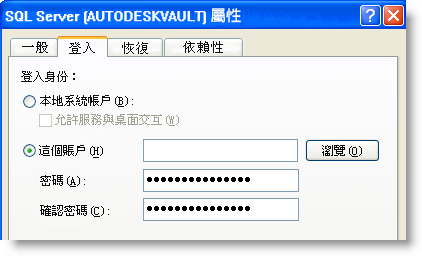按兩下「SQL Server (Autodeskvault)」服務,然後選取「登入」頁籤。