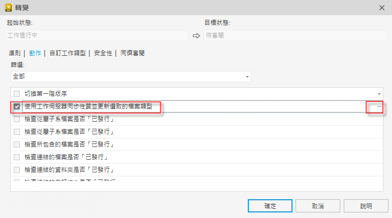 從「可用動作」清單中選取「使用工作伺服器同步性質並更新選取的檔案類型」勾選方塊。