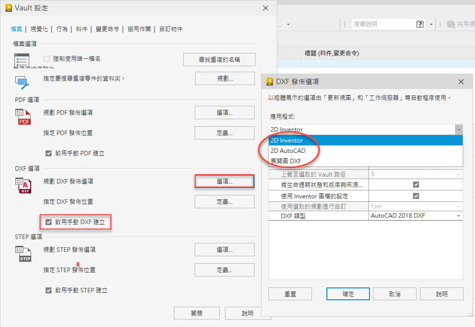 選取 AutoCAD 或 Inventor DXF 檔或展開圖 DXF 檔的設定。