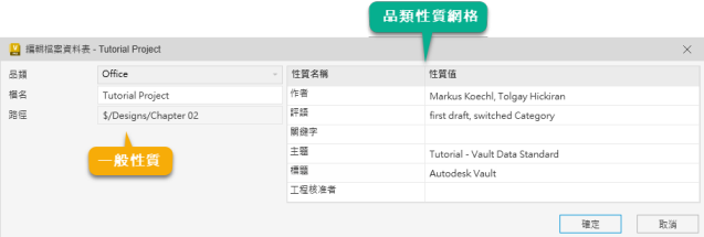 一般性質網格具有靜態定義、標示和繫結至 Vault 性質的內容控制,這些內容儲存在對話方塊定義檔中。動態網格是一個空網格物件,可透過選取圖元 (「檔案」、「資料夾」、「自訂物件」) 品類,來自動加入標示和值欄位。這兩個網格是「建立/編輯資料表」(請參閱之前的影像) 和詳細資料頁籤中「資料表」的核心元素: