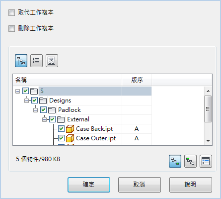 在「退回出庫使用」對話方塊中,指定是否要用目前儲存在 Vault 中的版本來取代本端檔案,以及是否要刪除該檔案的工作複本。選取「取代工作複本」以重置對該檔案工作複本所做的任何變更。
