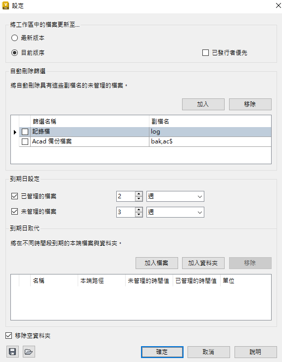 您可以指定將從工作區中自動刪除的不受 Vault 管理的檔案類型。同步期間,將刪除工作資料夾中與指定副檔名相符的所有檔案。系統提供了兩個篩選,二者依預設均為關閉:記錄檔 (.log) 和 ACAD 備份檔 (.bak、ac$)。