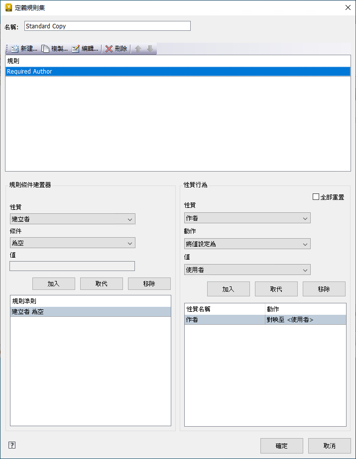在「性質行為」下,選取在複製作業期間符合前一步中的條件時,要出現的性質和動作。如果需要,選取性質動作的值。