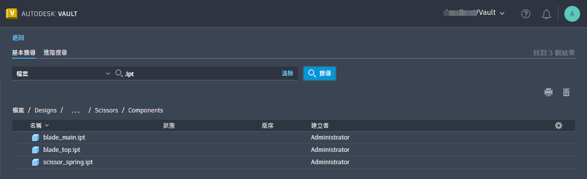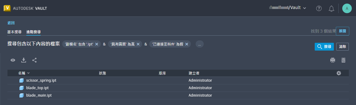 您可以使用進階搜尋準則,在 Vault 中的任意位置或不同工作區中搜尋物件。依預設,進階搜尋會從啟動搜尋的工作區開始。例如,如果您在「料件」工作區中並執行「進階搜尋」,則搜尋僅會從「料件」工作區傳回結果。