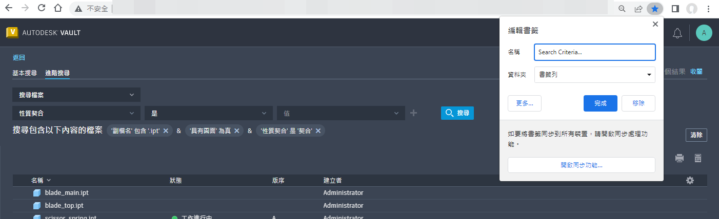 您可以將包含所需條件的進階搜尋儲存至網頁瀏覽器中的書籤,並快速重複使用。只需按一下書籤,即可再次尋找您的選取項。對於您打算重複使用的複雜查詢,此方法特別有用。