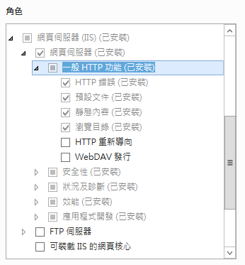 選取左側的「伺服器角色」並勾選「角色」清單中的「網頁伺服器 (IIS)」。