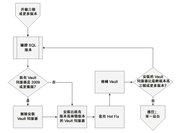 確認既有版本的 SQL 與要安裝的下一版 Vault 是否相容。如果既有 SQL 版本需要升級 (請參閱本文前一章〈升級 SQL〉),請執行任何必要的升級,然後再返回此節。