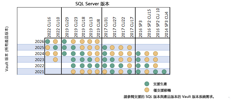 以下圖表總結了 Vault 和 SQL 的相容版本 (以綠色圓點表示)。黃色圓點表示建議的升級路徑。請參閱您的 Vault 版本對應的 Vault 系統需求,以確保 Vault 和 SQL 產品版本之間的相容性。