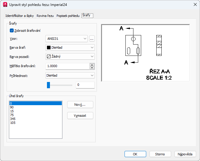 Nastaví šrafovací vzor, který se použije pro všechny šrafy v pohledech řezů.