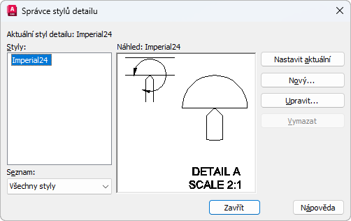 Zobrazuje seznam stylů detailu dostupných v aktuálním souboru výkresu. Aktuální styl je zvýrazněn.