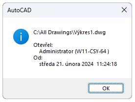 Po určení souboru výkresu se zobrazí plná cesta k souboru, přihlašovací jméno aktuálního uživatele, název počítače a datum s časem otevření souboru výkresu. Podobné informace se zobrazí automaticky, jakmile se pokusíte otevřít soubor výkresu, který má otevřený jiný uživatel.