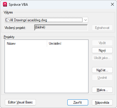 Určuje název vloženého projektu pro výkres. Pokud výkres neobsahuje žádný vložený projekt, je zobrazen údaj “(žádný)”.