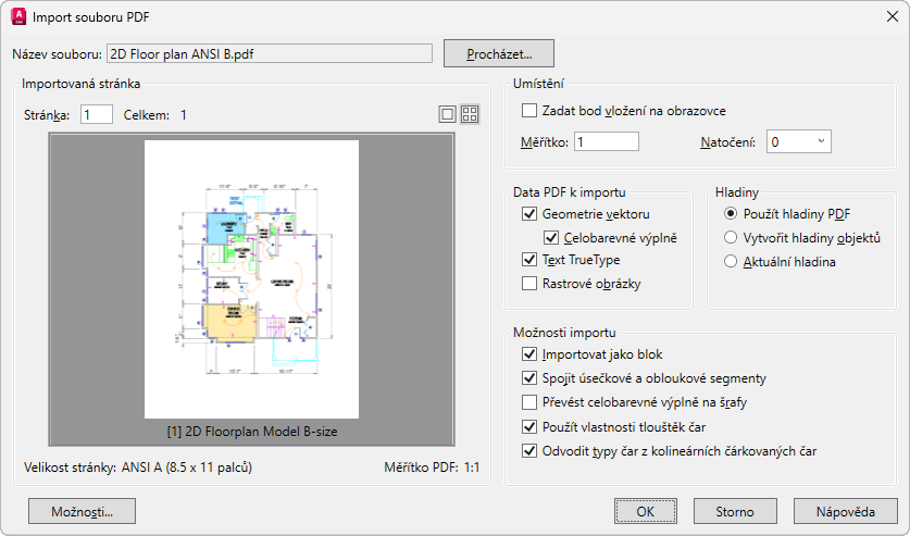 Vytvoří se hladiny aplikace AutoCAD z hladin uložených v souboru PDF a použijí se na importované objekty. Názvy hladin mají předponu PDF. Hladina objektu se vytvoří v případě, že se žádná hladina nenachází v souboru PDF.