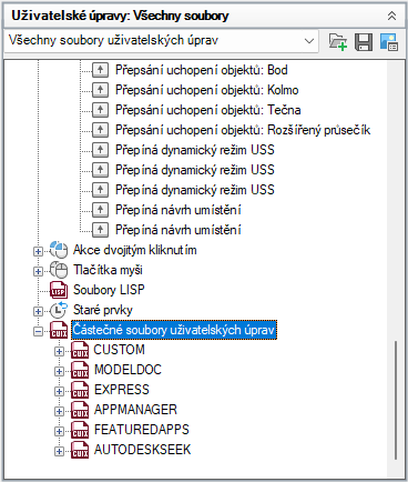 Podokno Uživatelské úpravy slouží k přechodu na různé prvky uživatelského rozhraní, které jsou uloženy v načtených souborech uživatelských úprav.