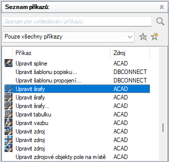 Podokno Seznam příkazů obsahuje všechny příkazy, které jsou k dispozici v aktuálně načtených souborech CUIx. V seznamu můžete vybrat existující příkaz a upravit jeho vlastnosti nebo vytvořit nový příkaz. Jestliže vytvoříte nový příkaz, bude přidán do souboru CUIx, který je zobrazen v rozevíracím seznamu v horní části podokna Uživatelské úpravy: <název souboru>.