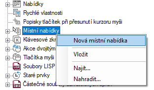 1. Na kartě Vlastní klikněte v podokně Uživatelské úpravy: <název souboru> pravým tlačítkem na uzel Místní nabídky a potom klikněte na příkaz Nová místní nabídka.
