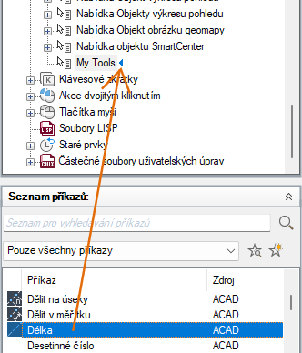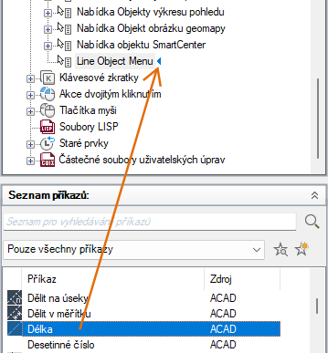 6. V podokně Seznam příkazů přetáhněte příkaz, který chcete přidat do místní nabídky, do podokna Uživatelské úpravy: <název souboru>.