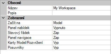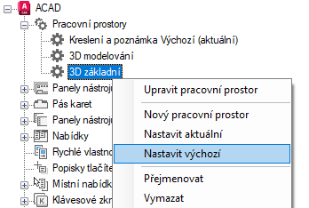 Pracovní prostory v souboru CUIx lze označit jako výchozí. Nastavení pracovního prostoru jako výchozího určuje, který pracovní prostor v souboru CUIx má být obnoven, pokud je soubor CUIx načten do aplikace poprvé nebo pomocí příkazu NAČTICUI.
