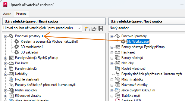 4. V podokně Uživatelské úpravy <název souboru> (vpravo) přetáhněte pracovní prostor ze souboru CUIx do uzlu Pracovní prostor hlavního souboru CUIx v podokně Uživatelské úpravy <název souboru> (vlevo).