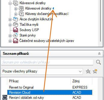• Chcete-li vytvořit klávesovou zkratku, přetáhněte požadovaný příkaz z podokna Seznam příkazů na uzel Klávesové zkratky v podokně Uživatelské úpravy: <název souboru>.