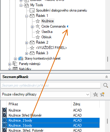 - Přetáhněte příkaz z podokna Seznam příkazů na řádek, dílčí panel nebo do rozevíracího seznamu na panelu.
