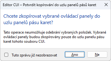 - V dialogovém okně Editor CUI – Potvrdit zkopírování do uzlu panelů pásu karet klikněte na možnost Ano.