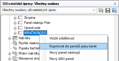 - Pravým tlačítkem klikněte na panel nástrojů, který chcete zkopírovat a převést na panel pásu karet. Vyberte položku Kopírovat do panelů pásu karet.