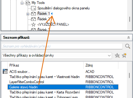 - Přetáhněte ovládací prvek z podokna Seznam příkazů na řádek na panelu pásu karet.