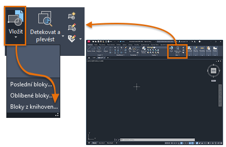 - Na kartě Výchozí klikněte na možnost Vložit a potom klikněte na možnost Bloky z knihoven. Tímto spustíte příkaz PALETABLOKY.