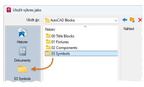 Tip: Když uložíte výkresy pro pozdější vložení, přejděte do složky, klikněte pravým tlačítkem a vytvořte několik dalších složek k uspořádání výkresů. Jeden nebo více bloků můžete přetáhnout na panel Místa, aby je bylo možné v budoucnosti snadno najít.