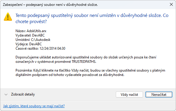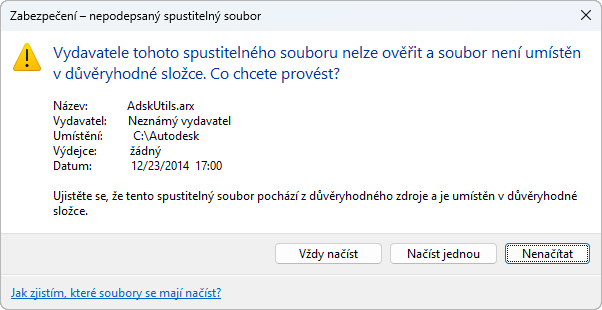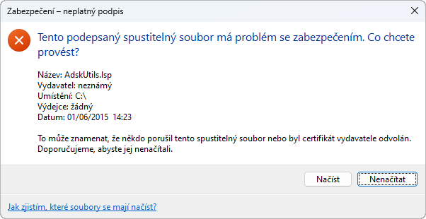 Při načítání vlastního souboru programu, který byl digitálně podepsán, ověří program založený na aplikaci AutoCAD nebo aplikace AutoCAD LT digitální podpis připojený k souboru. Zobrazí se hlášení, zda bylo možné ověřit digitální podpis, aby se mohl uživatel rozhodnout, zda soubor programu do prostředí výkresu načte nebo ne.