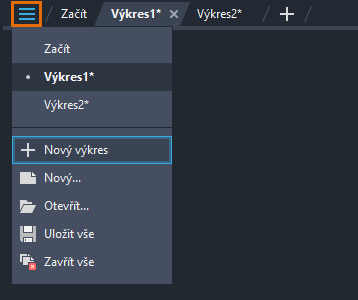 Pomocí nabídky karty souboru můžete zobrazit seznam otevřených výkresů, přepínat mezi výkresy, uložit všechny výkresy, zavřít všechny výkresy a další.
