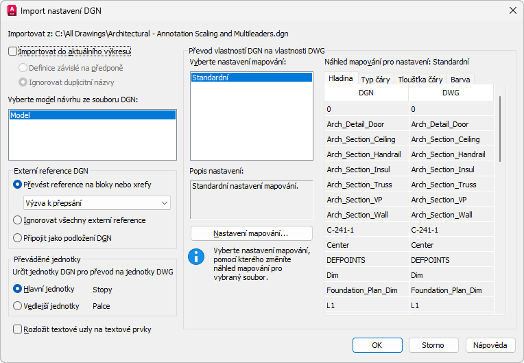 Standardním nastavením je výchozí nastavení mapování, které extrahuje data z exportovaného výkresu a používá automatické mapování hladin DGN, typů čar, tlouštěk čar a barev podle zobrazení v náhledu mapování.