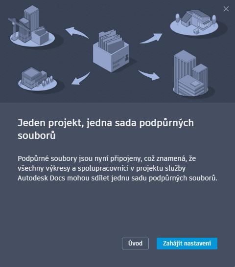 Následující kroky ukazují, jak nastavit připojené podpůrné soubory pro existující projekt Autodesk Docs.