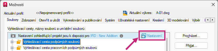 Informace o změně cest pro připojené podpůrné soubory naleznete v části Nastavení cest pro připojené podpůrné soubory projektu Autodesk Docs.