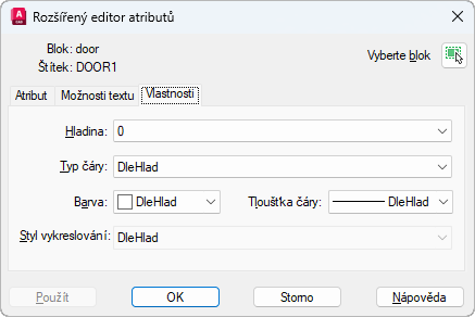 Definuje hladinu textu atributu, tloušťku čáry, typ čáry a barvu textu atributu. Pokud jsou ve výkresu použity styly vykreslování, můžete k atributu přiřadit styl vykreslování pomocí karty Vlastnosti.