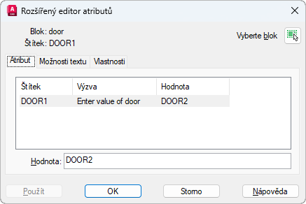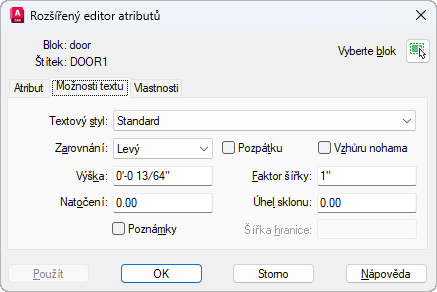 Nastaví vlastnosti, které určují způsob zobrazení textu atributu ve výkresu. Barvu textu atributu lze změnit na kartě Vlastnosti.