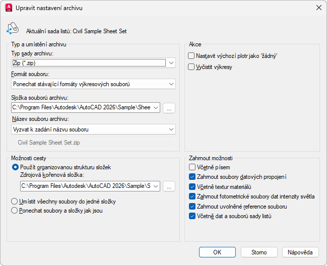 Určuje formát soubory, do kterého budou výkresy zahrnuté v archivu převedeny. Formát souboru výkresu můžete vybrat z rozevíracího seznamu.