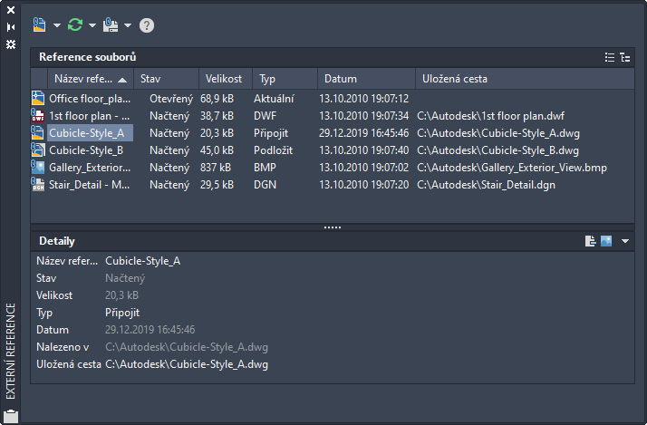 Paleta Externí reference slouží k uspořádání, zobrazení a správě odkazovaných souborů, například souborů DWG (externí referencí), DWF, DWFx, PDF, podložení DGN, rastrových obrázků, mračen bodů (soubory RCP a RCS) a modelů koordinace (soubory NWD a NWC).